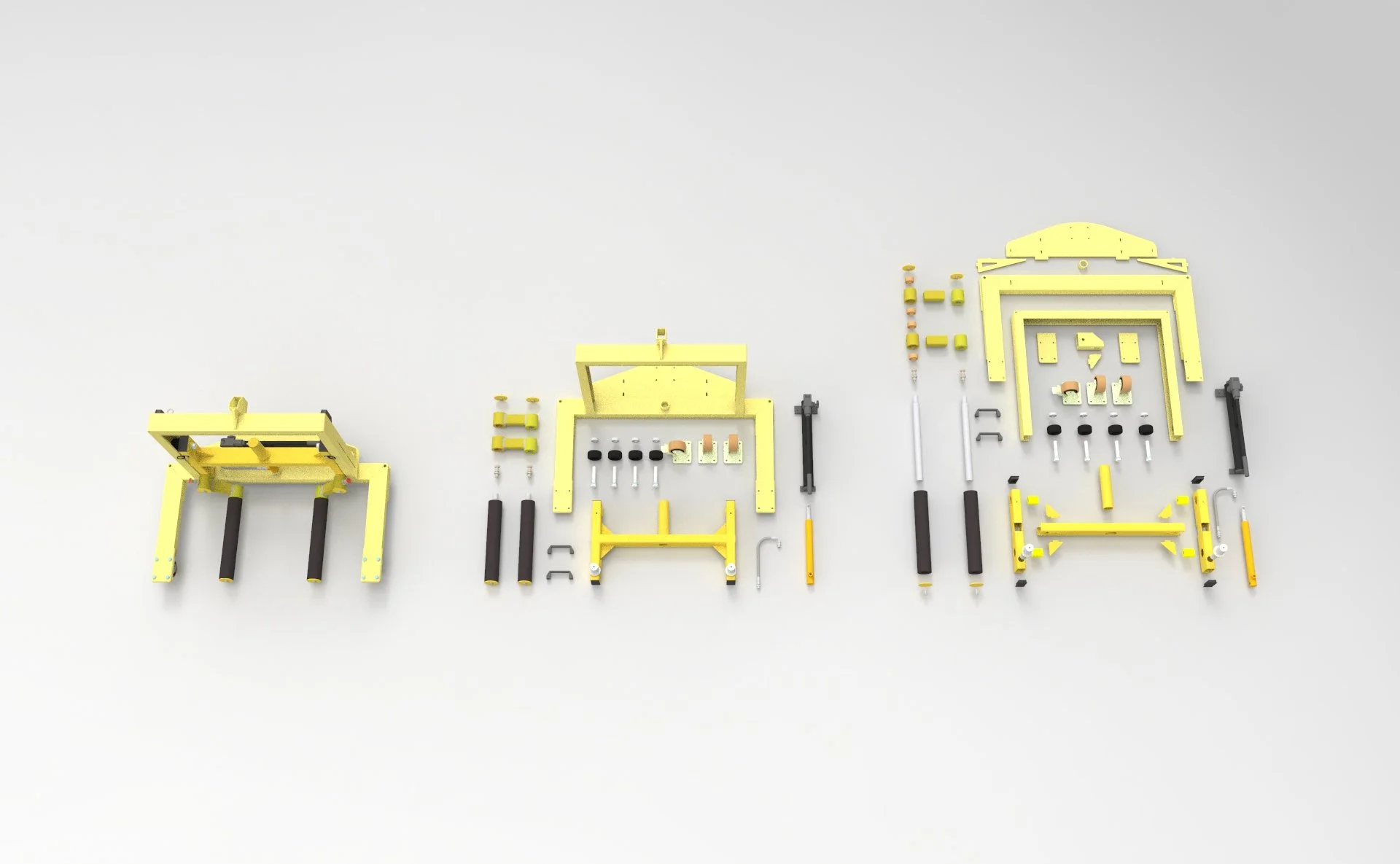 The design includes a pin index system for positioning the rollers to the required pitch of the wheels being removed. Raising and lowering is carried out by a simple and effective hydraulic pump.